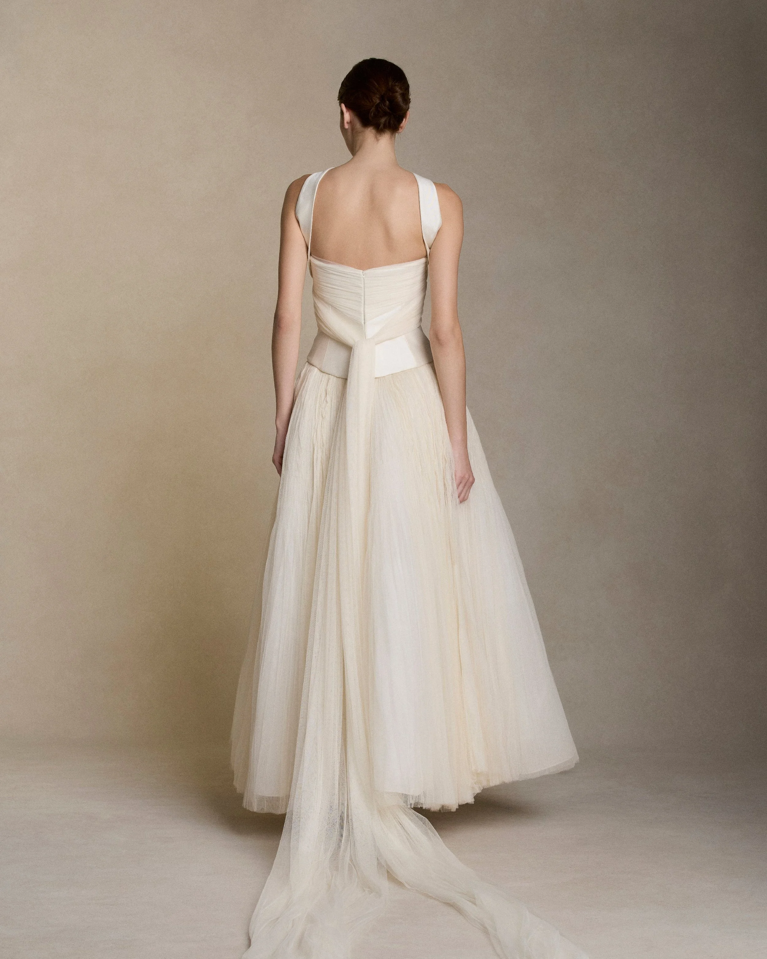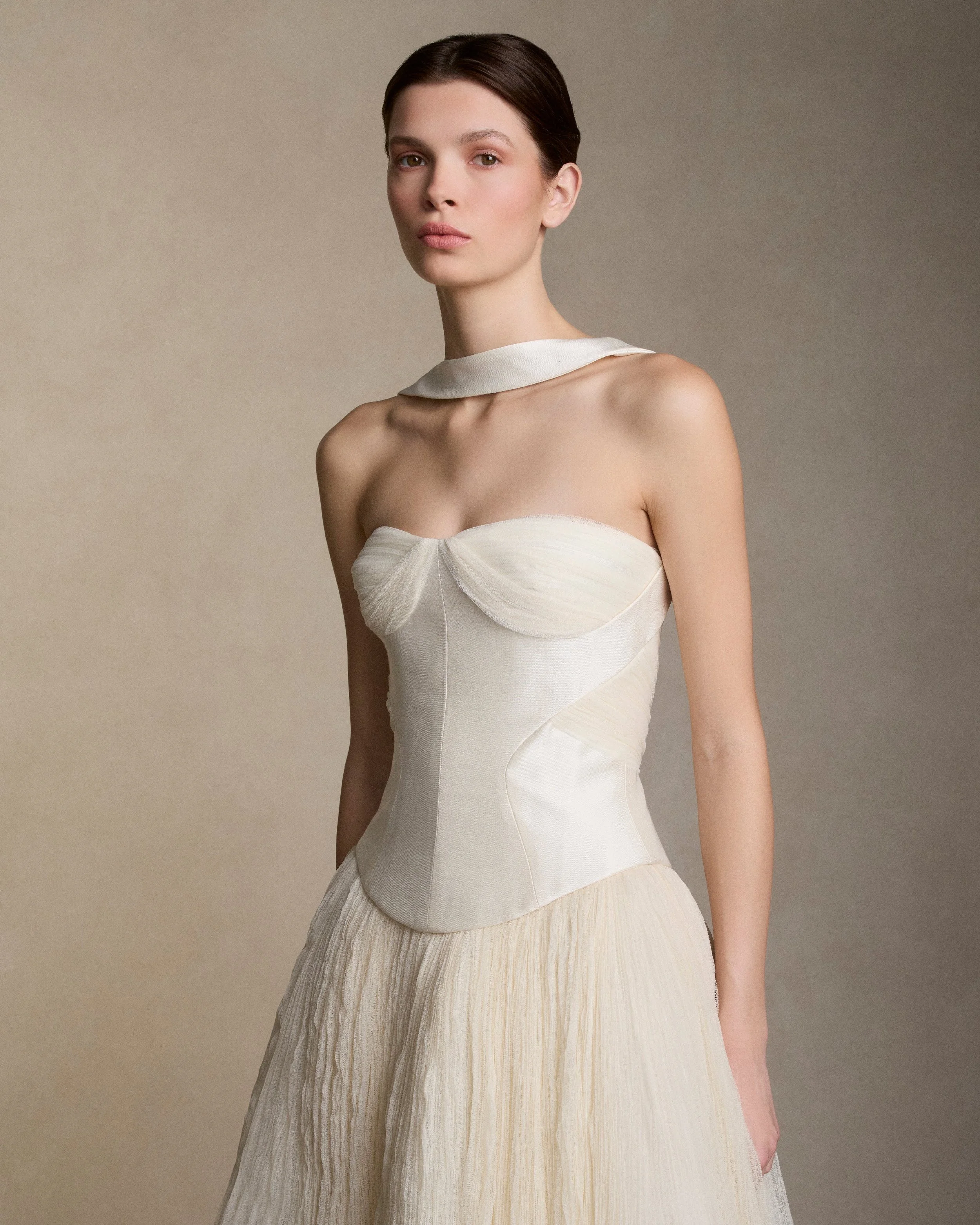 Silk wool twill bustier with curved shaped seams and attached neck wrap detail. Gathered and draped soft tulle frames the bust wrapping the body descending into tulle streamers at center back. Boned internal bustier, internal grosgrain belt and invisible zip closure at center back. Styled with Georgia Skirt.